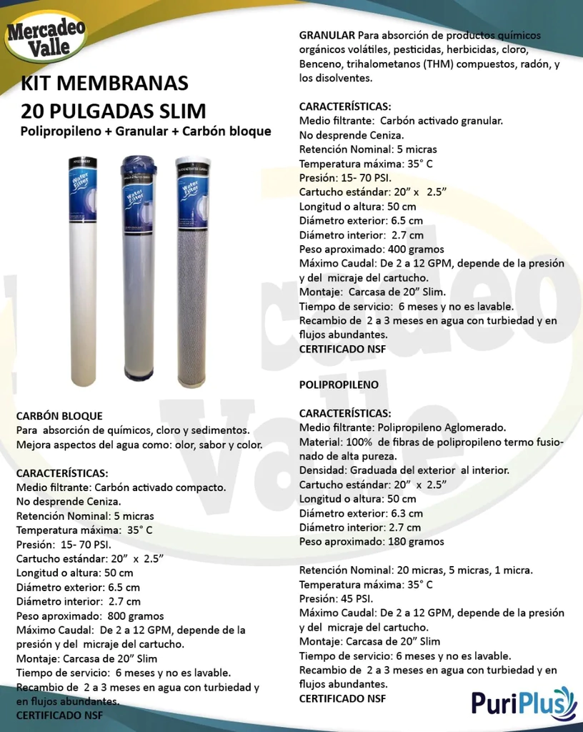 Es la tercera etapa de filtración de agua, la membrana de carbón está elaborada con carbón compacto, por la estructura única de sus poros es usada para la absorción de químicos, cloro y compuestos orgánicos volátiles, mejorando los aspectos estéticos del agua, elimina el mal olor, mejora la turbiedad mejora el sabor del agua, además que retiene igualmente sedimentos y otras partículas sólidas. REEMPLACE CADA 6 MESES