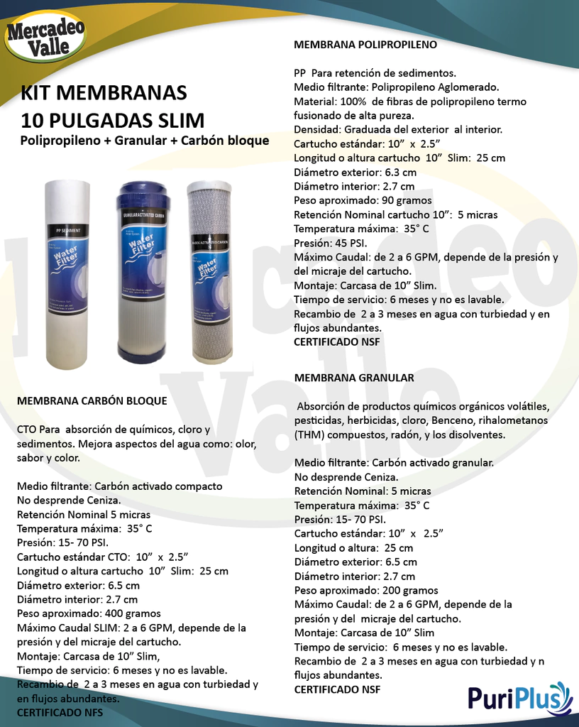 La membrana de carbón está elaborada con carbón compacto, por la estructura única de sus poros es usada para la absorción de químicos, cloro y compuestos orgánicos volátiles, mejorando los aspectos estéticos del agua, elimina el mal olor, mejora la turbiedad mejora el sabor del agua, además que retiene igualmente sedimentos y otras partículas sólidas. Reemplace cada 6 meses.