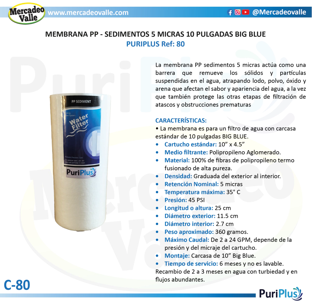 La membrana PP sedimentos 5 micras actúa como una barrera que remueve los sólidos y partículas suspendidas en el agua, atrapando lodo, polvo, óxido y arena que afectan el sabor y apariencia del agua, a la vez que también protege las otras etapas de filtración de atascos y obstrucciones prematuras